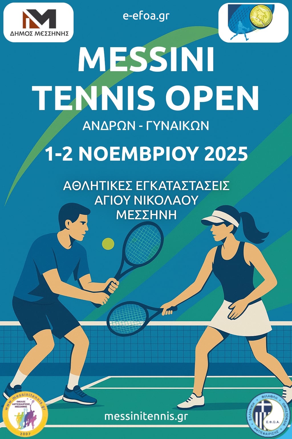 Με μεγάλη επιτυχία ολοκληρώθηκε το βαθμολογούμενο τουρνουά Ε3 OPEN Ανδρών – Γυναικών, που διοργάνωσε ο Σύλλογος Αντισφαίρισης Μεσσήνης υπό την αιγίδα της ΣΤ’ Ένωσης Σωματείων Αντισφαίρισης Πελοποννήσου και του Δήμου Μεσσήνης 1&2 Νοέμβρη 2025.