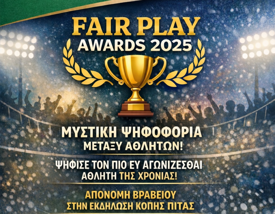 Η απονομή του Fair Play Awards 2025 θα πραγματοποιηθεί στο πλαίσιο της εκδήλωσης κοπής της πρωτοχρονιάτικης πίτας, το Σάββατο 10 Ιανουαρίου 2025 και ώρα 20:30 στην αίθουσας KOUZIS EVENTS. Πληροφορίες - Κρατήσεις για την Κοπή της Πίτας πατήστε εδώ